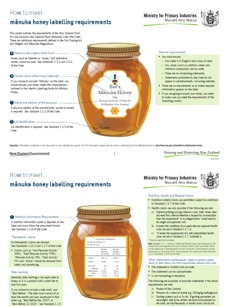 Labelling and composition of honey and bee products We developed A guide to New Zealand honey labelling to help honey extractors, packers, manufacturers, and importers meet the requirements of the Food Standards Code, Fair Trading Act, and Weights and Measure Regulations. The guide includes a sample nutrition information panel (NIP) you can use.