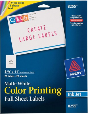 Avery Vibrant Color Printing Laser/Inkjet Shipping Labels, 8 1/2" x 11", White, 20 Labels/Pack (08255)